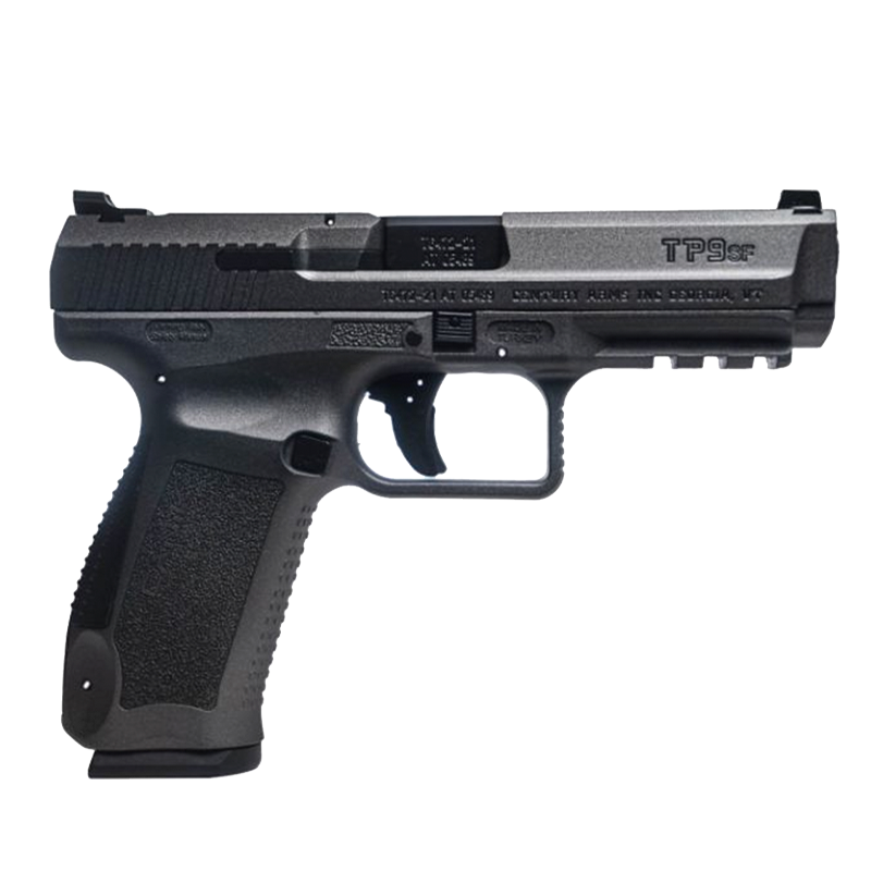 Pistola semiautomática CANIK TP9 SF, calibre 9 mm, con corredera y armazón en acabado negro.